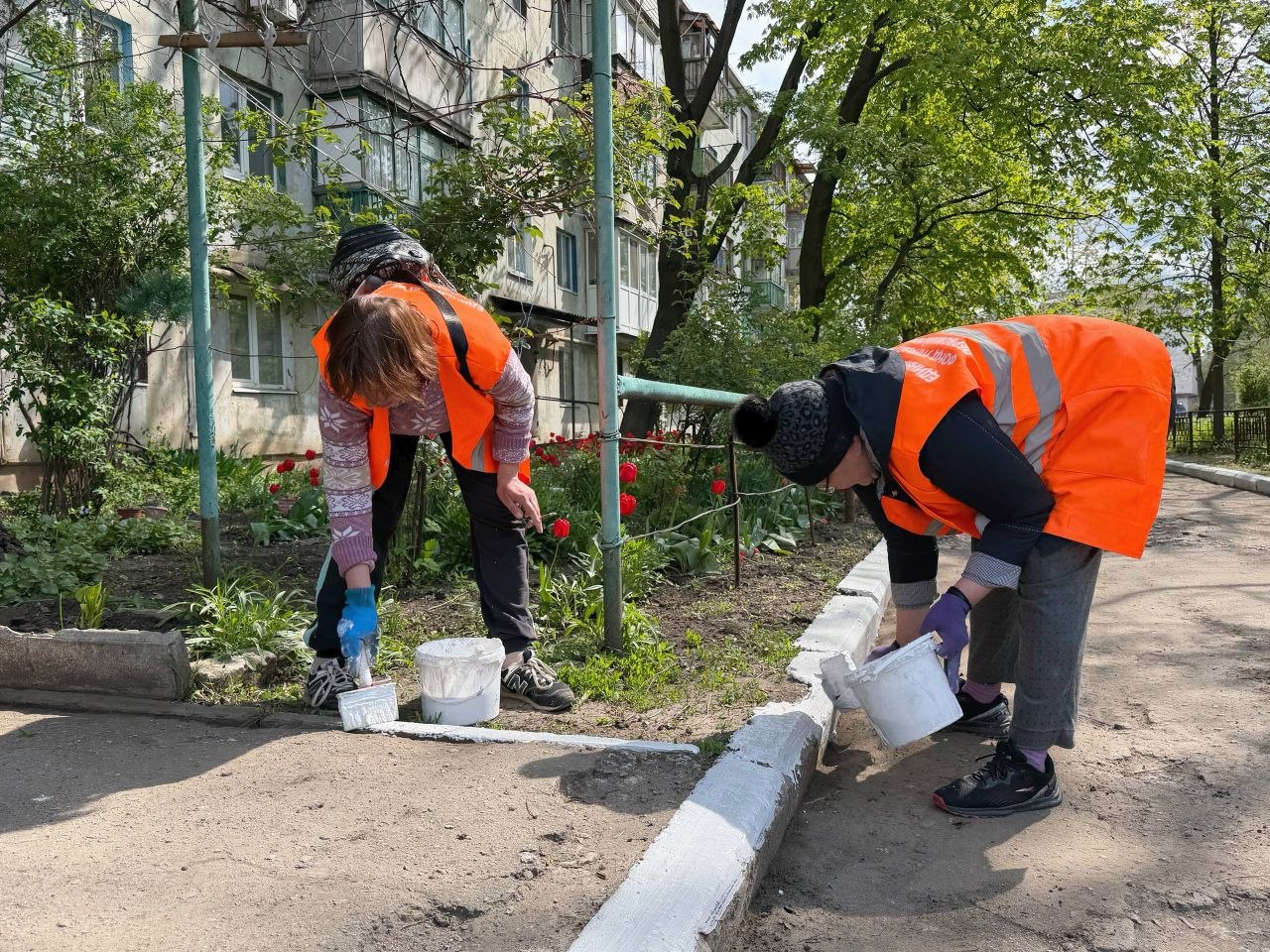 На этой же улице работники Первомайского филиала НКО «ЕУК» занялись уборкой наносного грунта и побелкой бордюров внутри дворов.