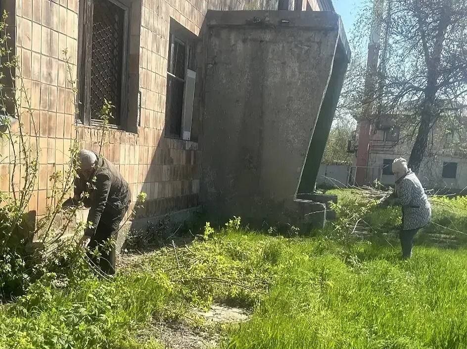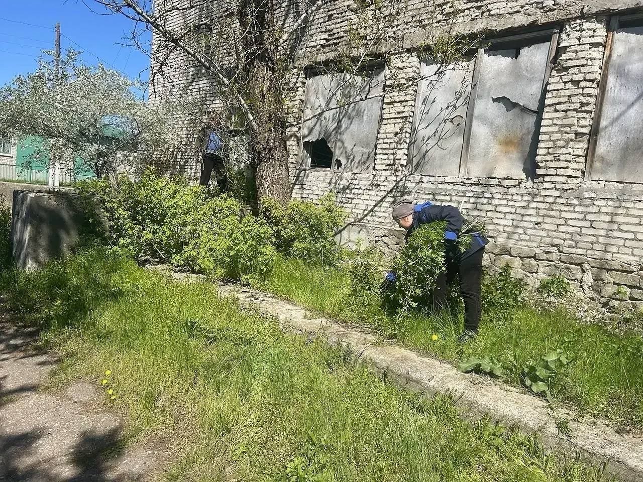Тем временем в пгт Калиново команда отдела по жизнеобеспечению при поддержке работника почты и социального работника занялась уборкой территории, прилегающей к центральной улице Ленина.