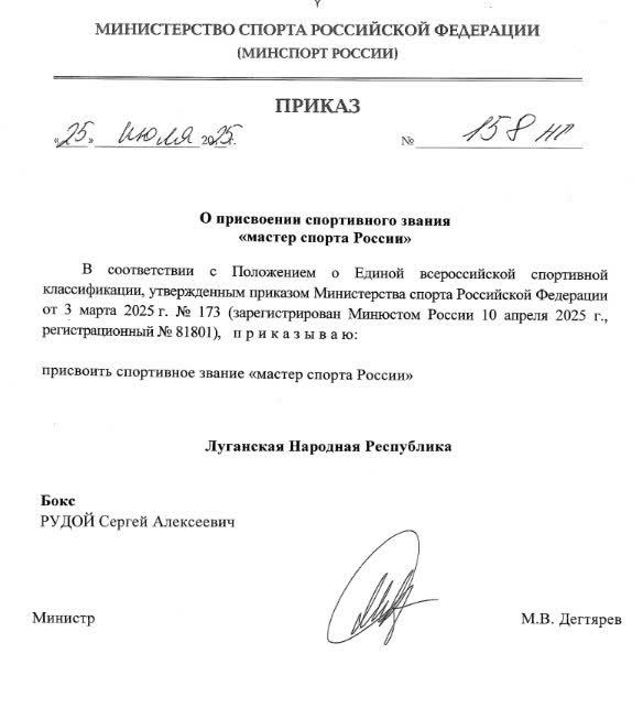 В соответствии с Положением о Единой всероссийской спортивной классификации и приказом Министерства спорта Российской Федерации №158 нг от 25 июля 2025 года спортивное звание «Мастер спорта России» присвоено боксеру Республиканской Федерации бокса ЛНР: