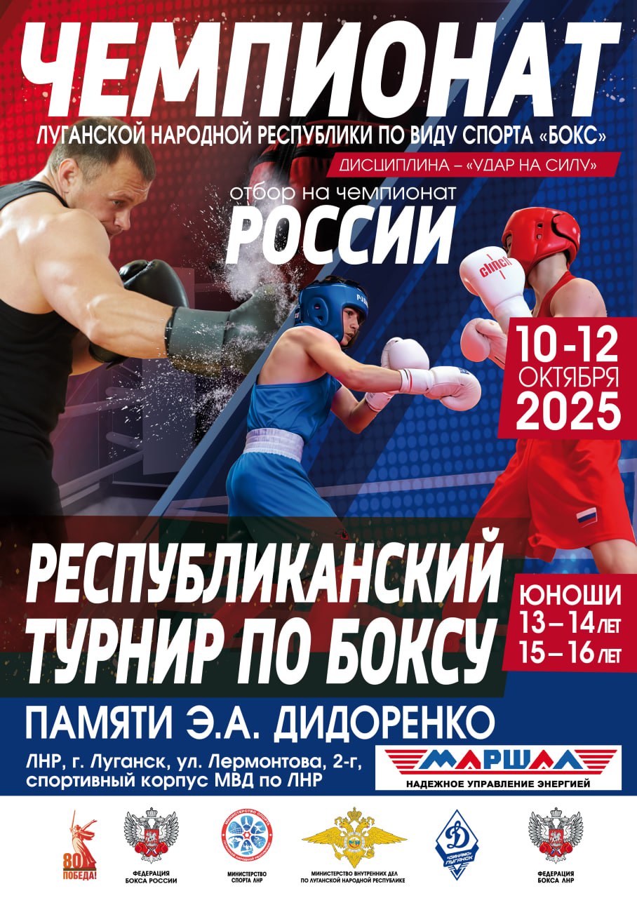 10 -12 октября 2025 г. пройдет Чемпионат Луганской Народной Республики по виду спорта «бокс» (дисциплина – «удар на силу») и XII Республиканский турнир по боксу, памяти Эдуарда Алексеевича Дидоренко среди юношей 13 – 14 лет (2012-2011 г.р), юношей 15 - 16 лет (2009-2010 г.р) г.Луганск ул. Лермонтова, 2-г. спортивный корпус МВД по ЛНР, зал бокса.
