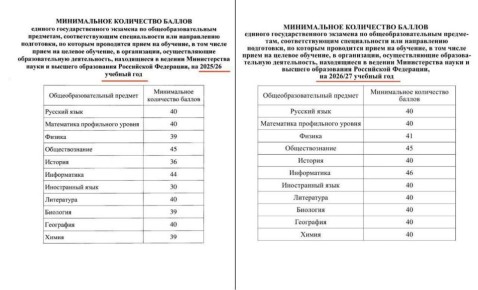 Минимальные баллы по каждому предмету теперь такие:Химия, Биология — 40;Физика — 41;Информатика — 46;История — 40;Иностранный язык — 40.Решение принято после анализа приёмной кампании 2025/26: университеты не смогут опускать пороги ниже этих...
