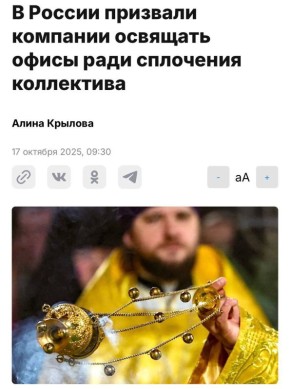 Так собираются повысить эффективность работы, считают парламентарии.Они уверены, что святая вода и короткий обряд помогут не только защитить коллектив от нечистых сил, но и поднять корпоративный дух.Подписаться...